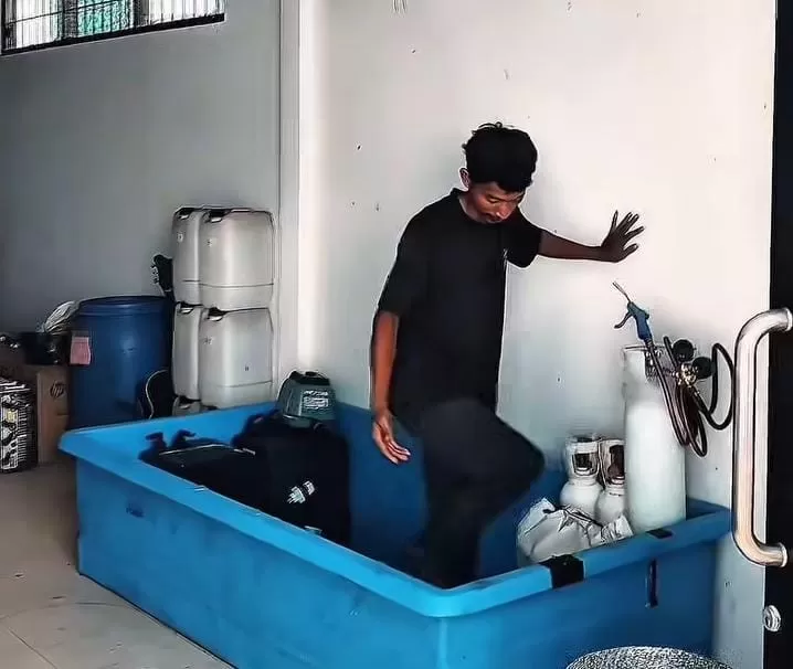 Ketiga orang itu melakukan pengelolaan benih lobster sebelum dilakukan packing.